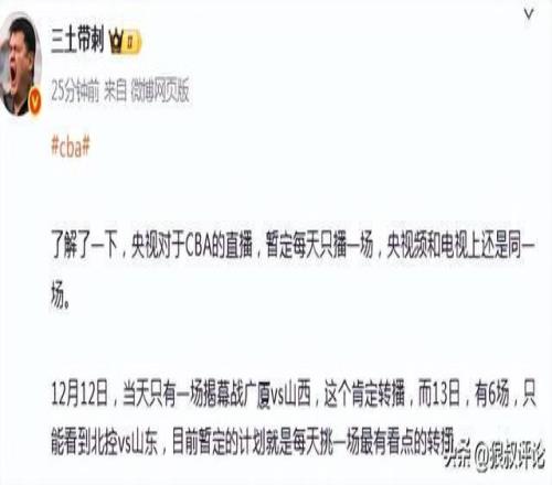 北京时间12月10日,根据媒体人三土带刺的发文报道,央视对于CBA的直播,暂定每天只播一场,央视频和电视上还是同一场。