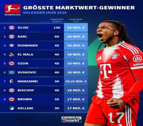 本周,德转盘点了德甲球员2025年身价上涨数据,拜仁边锋奥利塞本年度身价上涨6500万欧,高居榜首。小将伦纳特-卡尔、扬-迪奥曼德、赛义德-马拉进身价上涨榜前十名。